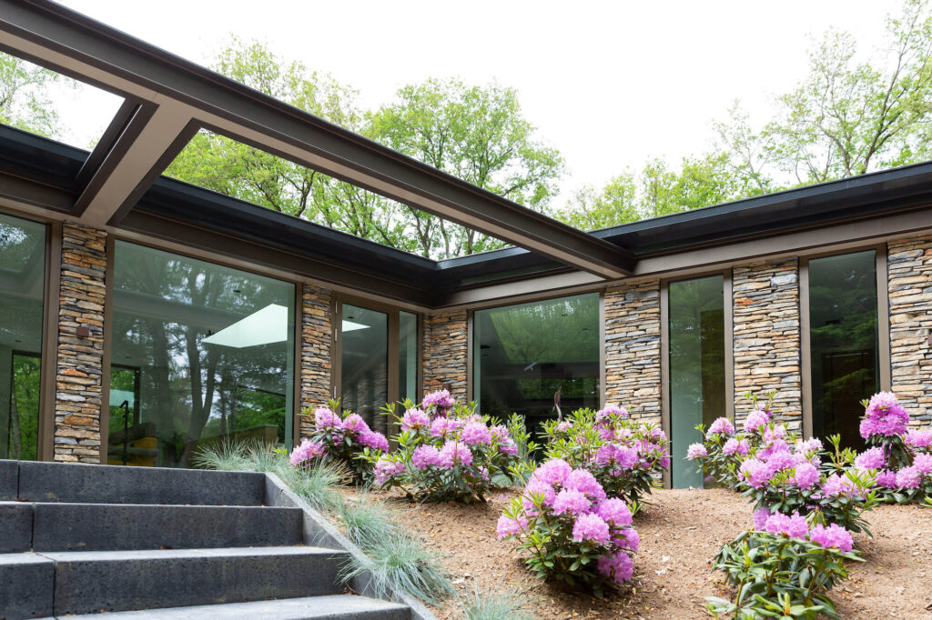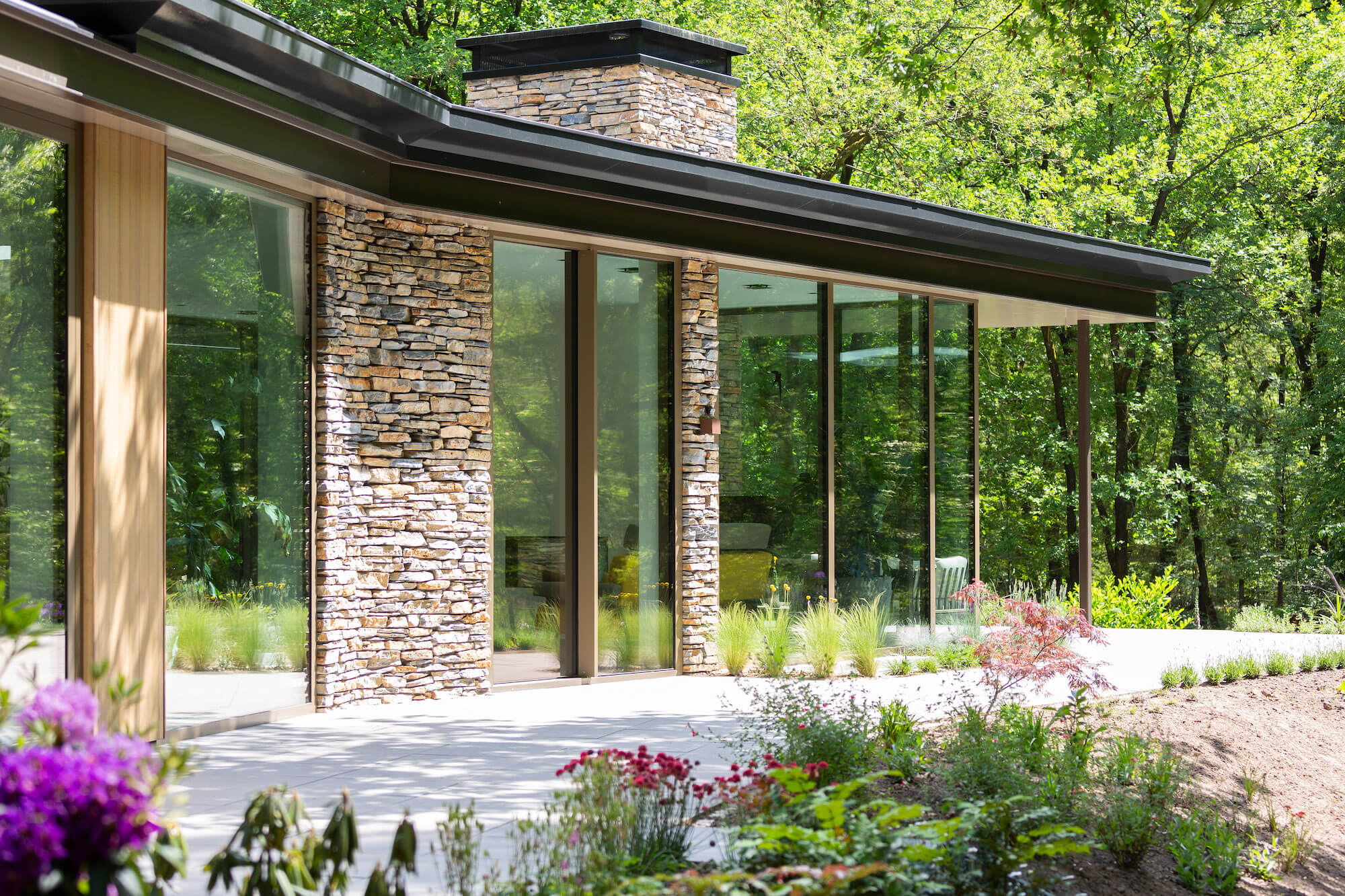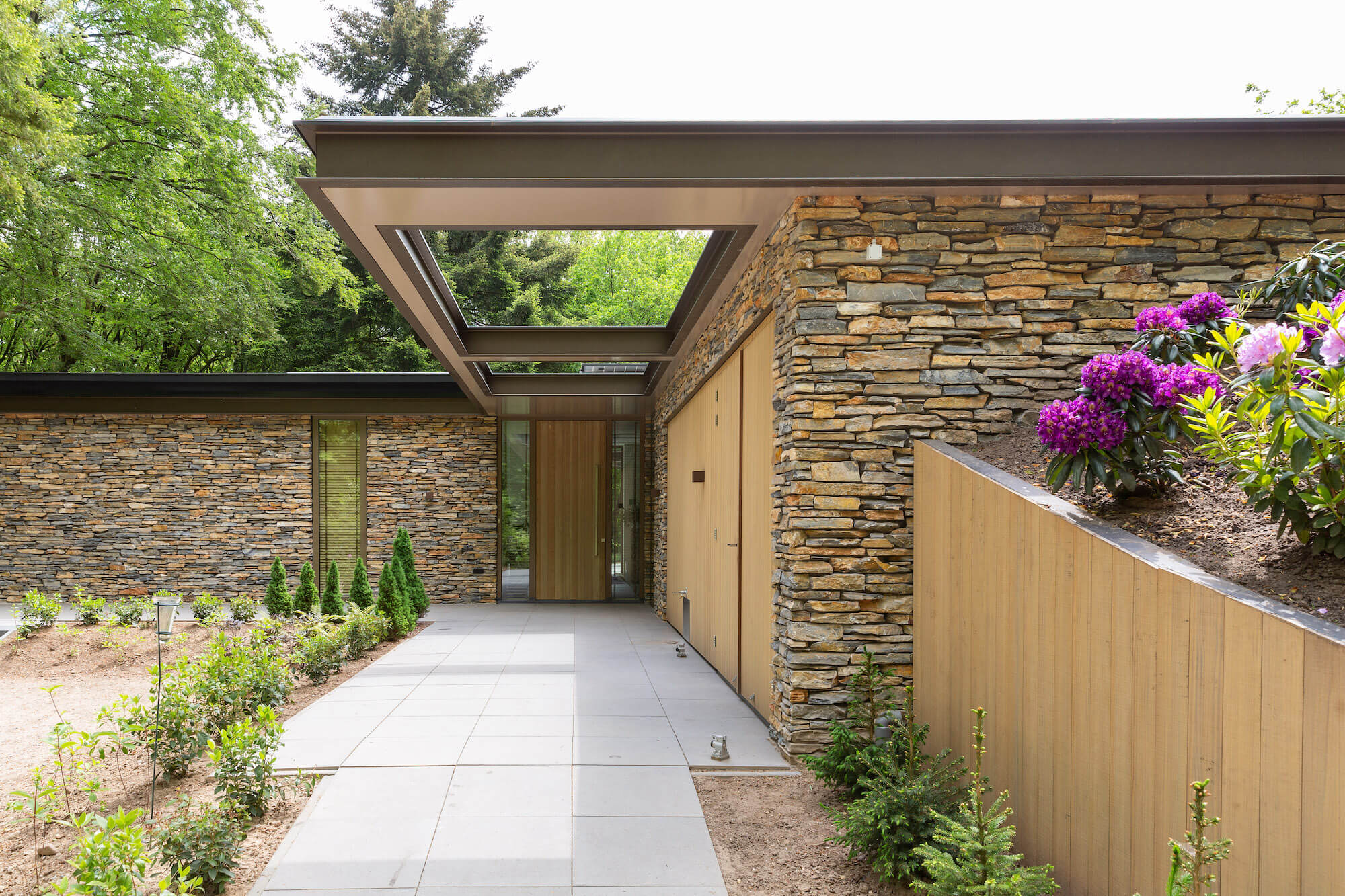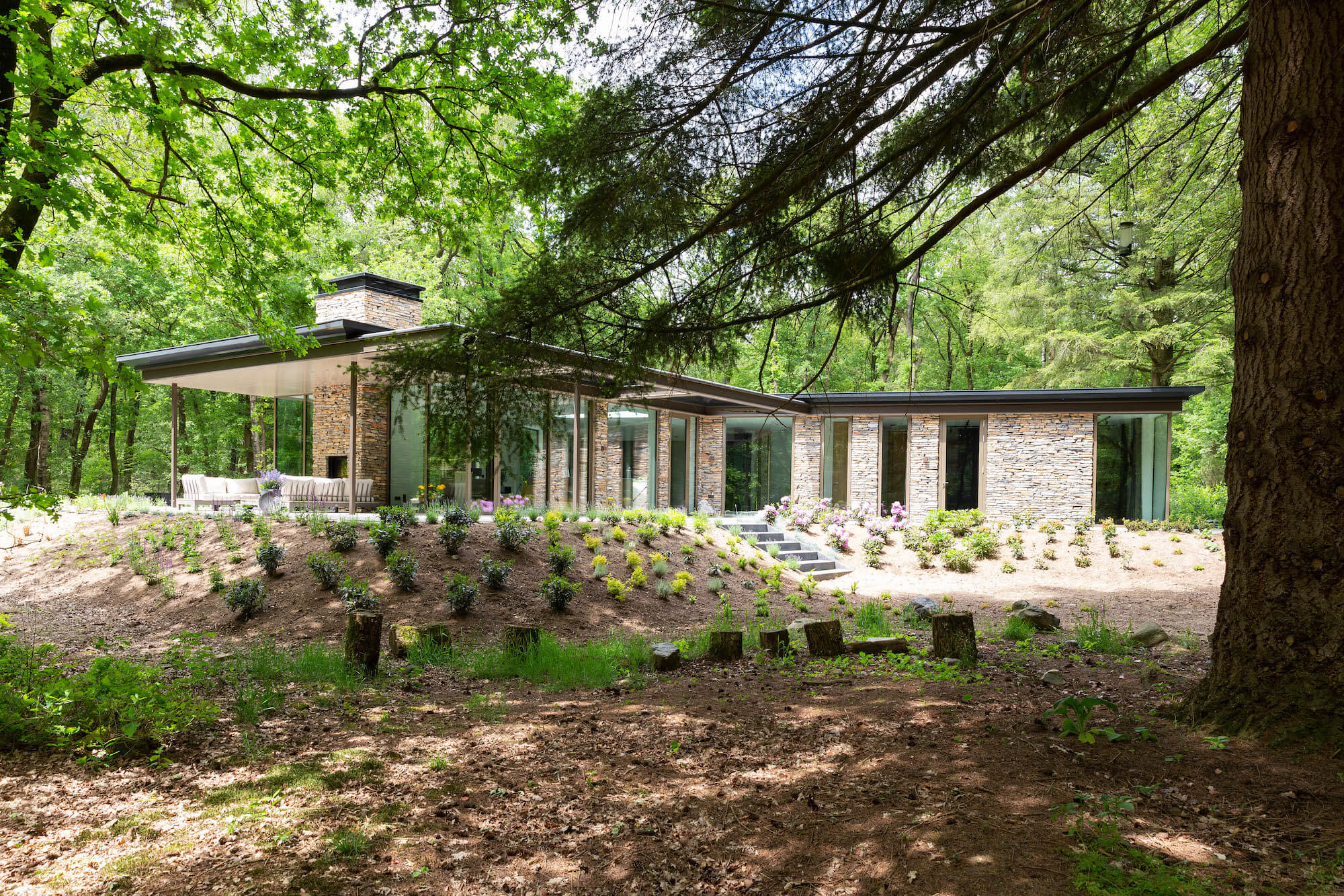 This contemporary villa is a refined architectural statement where modern design and natural materials come together. Strong lines, generous roof overhangs and an understated palette define its character. The extensive use of natural stone allows the home to blend seamlessly into its green surroundings, creating an architecture that feels both powerful and naturally connected to its landscape.