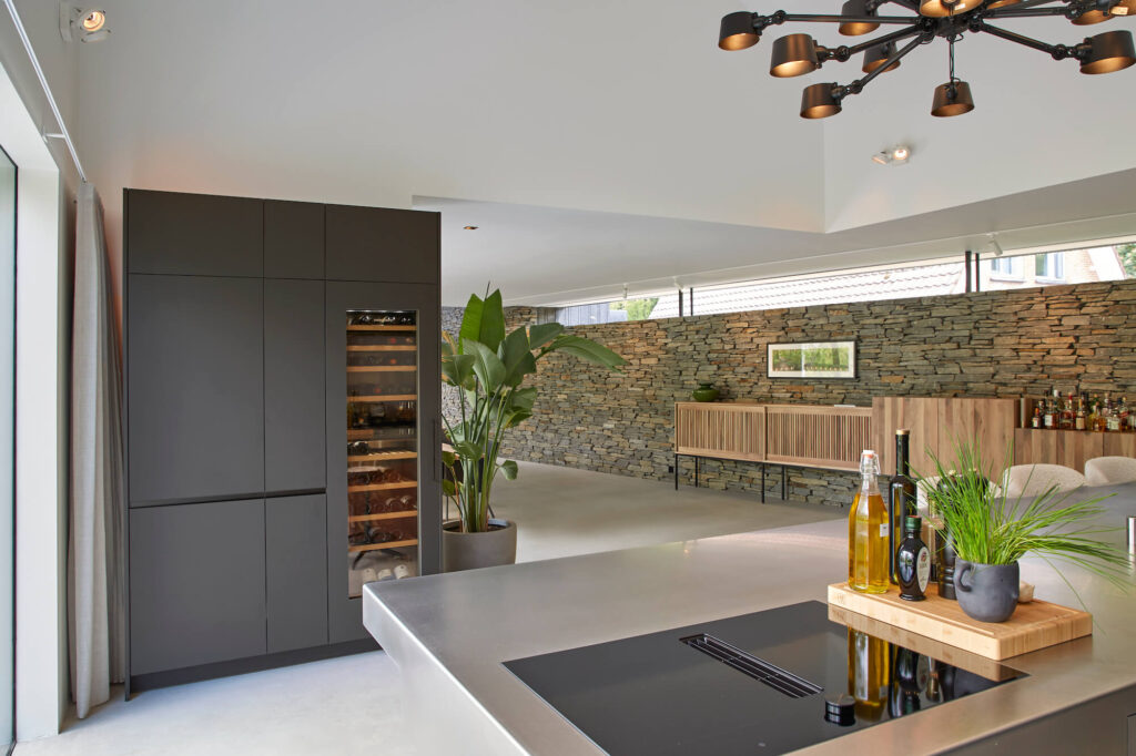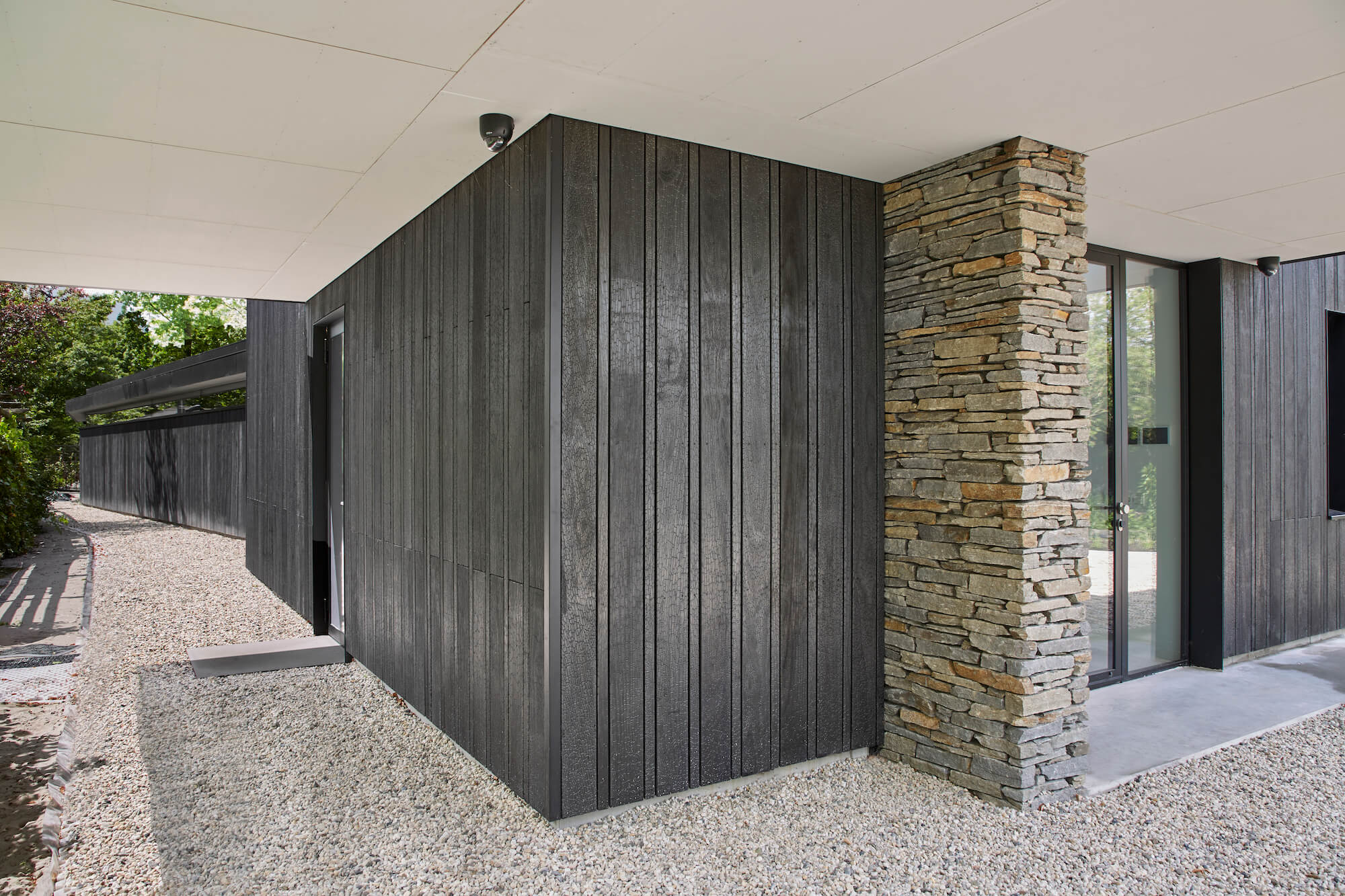 Both the interior feature wall and exterior stone details are crafted from Karlovy Vary KV12R. This highly expressive selection showcases rich nuances from brown to anthracite, creating a robust yet refined aesthetic. The joints have been recessed, giving the masonry a stacked, tactile appearance and enhancing the stone’s natural texture. The result is a harmonious interplay of materials that unifies the villa’s design from inside to out.